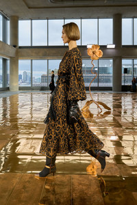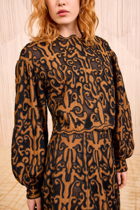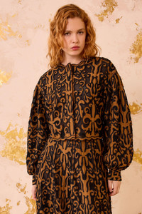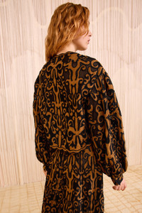 The Coletta Jacket is richly crafted from Victorian-inspired embroidered applique, set against a delicate black mesh with intricate taffeta patchwork in deepest saffron. This statement jacket is sculpted with voluminous, blouson sleeves and coordinates with the Gili Skirt for maximum impact, as seen on the AW25 runway in Look 36. - Mesh applique, taffeta, and habotai - Model Height: 5'11" - Designed for a relaxed fit - Cropped - Long sleeves with button cuffs - Concealed buttons through front - Composition: shell 100% silk; combo 100% polyester - Dry clean only - Tassel belt for styling and not included with jacket