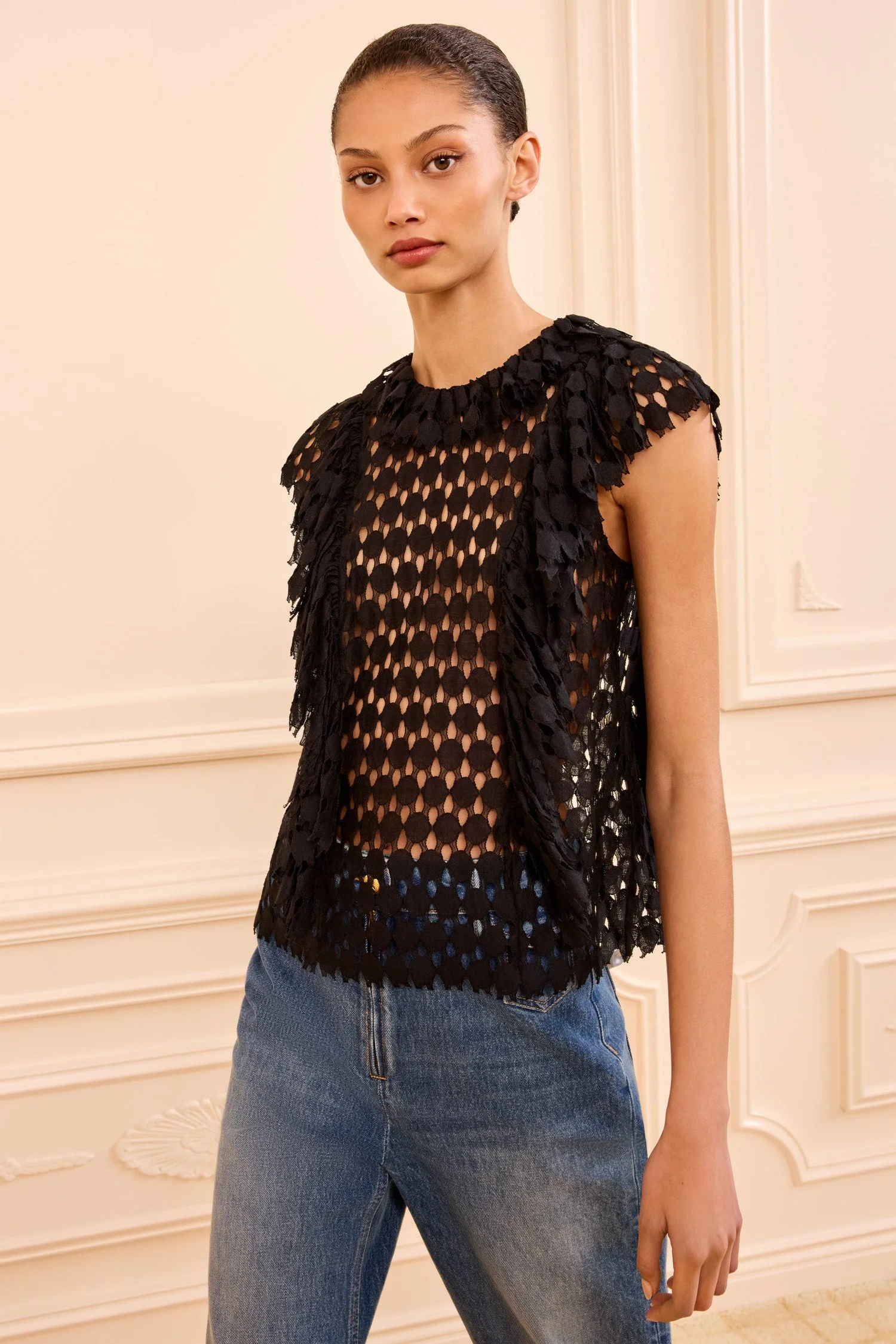 The Daevy Top is inspired by traditional French Alencon needle lace. Defined by delicate open work, this black top is trimmed with gestural ruffles and arrives with an optional lining for endless versatility. - Cotton lace - Model Height: 5'11" - Designed for a relaxed fit - Round neckline - Sleeveless - Removable silk camisole - Mother-of-Pearl button keyhole at back - Composition: 68% cotton, 32% polyamide - Dry clean only - Style# SP260205