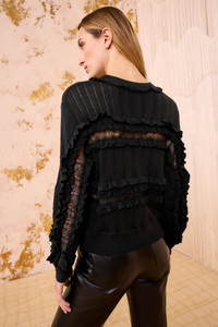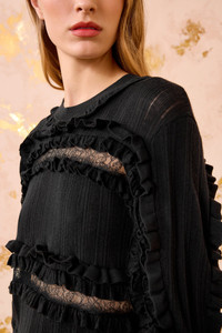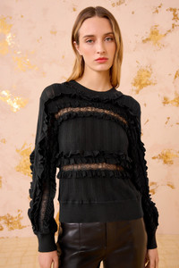 The Demma Pullover combines classic black with intricate detailing, featuring Chantilly lace inserts that playfully reveal and is trimmed with bursts of traveling ruffles. It is spun from merino wool with a softly ribbed texture for a luxurious, cold-weather staple. - Merino wool knit - Model Height: 5'11" - Designed for a relaxed fit - Crew neckline - Long sleeves - Pullover style - Composition: 100% merino wool - Dry clean only