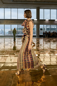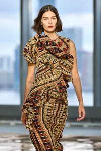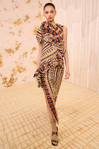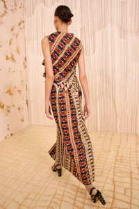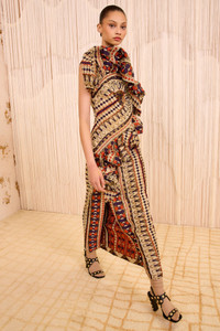 The Estela Dress debuts in Look 56 on the AW25 runway. Cut from Italian tapestry jacquard, this multicolored dress features mesmerizing geometric shapes, jewel tones, and a variety of rich textures. An asymmetrical bubble ruffle travels along the front of the bodice, while the fabrication’s lightweight quality offers a comfortable, wearable fit. - Jacquard - Model Height: 5'10" - Designed for a close, structured fit - Midi length - Sleeveless - Bias-cut bodice - Side split - Silk lining - Concealed back zipper - Composition: 46% polyester, 36% silk, 10% metallized polyester, 8% polyamide - Dry clean only