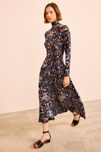 A signature silhouette, Fernanda Dress arrives in lightweight jersey that’s silky-smooth with swirling botanicals against a deep midnight blue. This wear-everywhere style is designed with an elegant high turtleneck and light gathering at the waist that unfurls to soft volume. - Tricot jersey - Model Height: 5'10" - Designed to fit close in the bodice, loose at hip - Midi length, asymmetric drop waist - Turtleneck - Long sleeves - Pullover style - Composition: 100% lyocell - Gentle machine wash