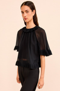 The Helaine Top is a study in fluid ease, crafted of silk chiffon in black for endless versatility. Designed to be elegantly oversized, this top has a high-low hemline and is finished with gestural, pleated ruffles. - Silk chiffon - Model Height: 5'10" - Designed for an oversized fit - Round neckline - Voluminous, flutter short sleeves - High-low hemline - Button keyhole at back - Composition: 100% silk - Dry clean only