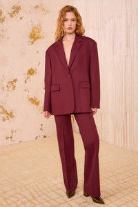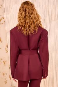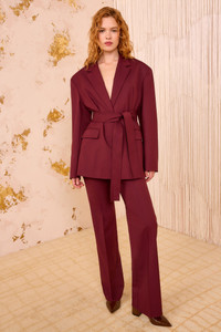 The Illana Blazer is tailored from sleek wool gabardine with bold shoulders and a modern, boxy fit that can be tempered with the removable belt. Coordinate this Bordeaux red style with the matching Quartier Pant for a casually elegant look. - Wool-blend gabardine - Model Height: 5'11" - Designed for a boxy, oversized fit - Notch lapels - Drop shoulders - Long sleeves with button cuffs - Removable tie belt - Flap pockets - Button at front - Composition: 53% polyester, 43% virgin wool, 4% elastane - Hand wash or dry clean