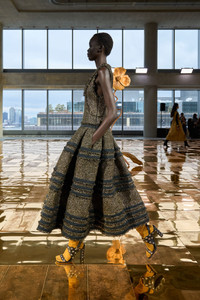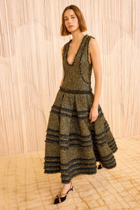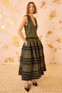 Look 2 from the AW25 runway debuts the Inez Dress, a glittering silhouette in Italian tweed featuring lurex threads interwoven with soft black yarns. A rounded, plunging neckline and fitted waist cascade into a generously gathered skirt, with tiers of frayed trims and black taffeta heighten the visual dimension. - Textured tweed - Model Height: 5'10" - Designed to be fitted at the bodice, loose at hip. - Midi length, dropped waist - U-neckline - Side pockets - Concealed side zipper - Composition: 48% polyamide, 25% polyester, 10% virgin wool, 10% acrylic, 7% metallized polyester - Dry clean only