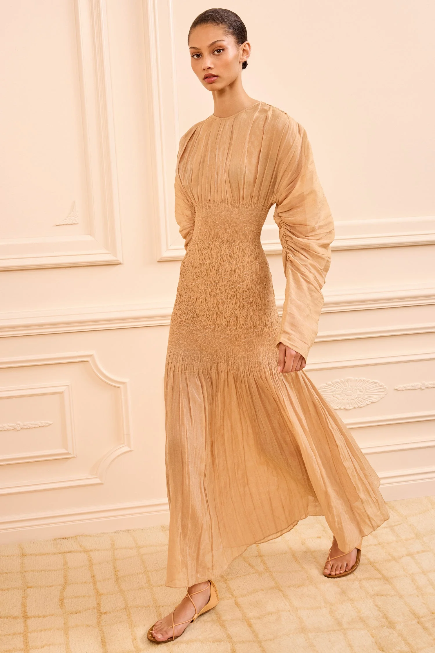 Featured in Look 25 on the SS26 Runway, the Irina Dress is richly crafted from a cotton-silk blend with a tonal wave jacquard motif. Designed with a sense of occasion, this tan dress is smocked throughout the bodice, releasing into sculptural sleeves and a full, airy skirt. - Italian cotton silk - Model Height: 5'10" - Designed with a relaxed bust, elastic smocking though hip, volume at hem - Maxi length - Round neckline - Voluminous long sleeves - Unlined - Button keyhole at back - Composition: 65% cotton, 28% silk, 6% nylon, 1% elastane - Delicate dry clean - Style# SP260116