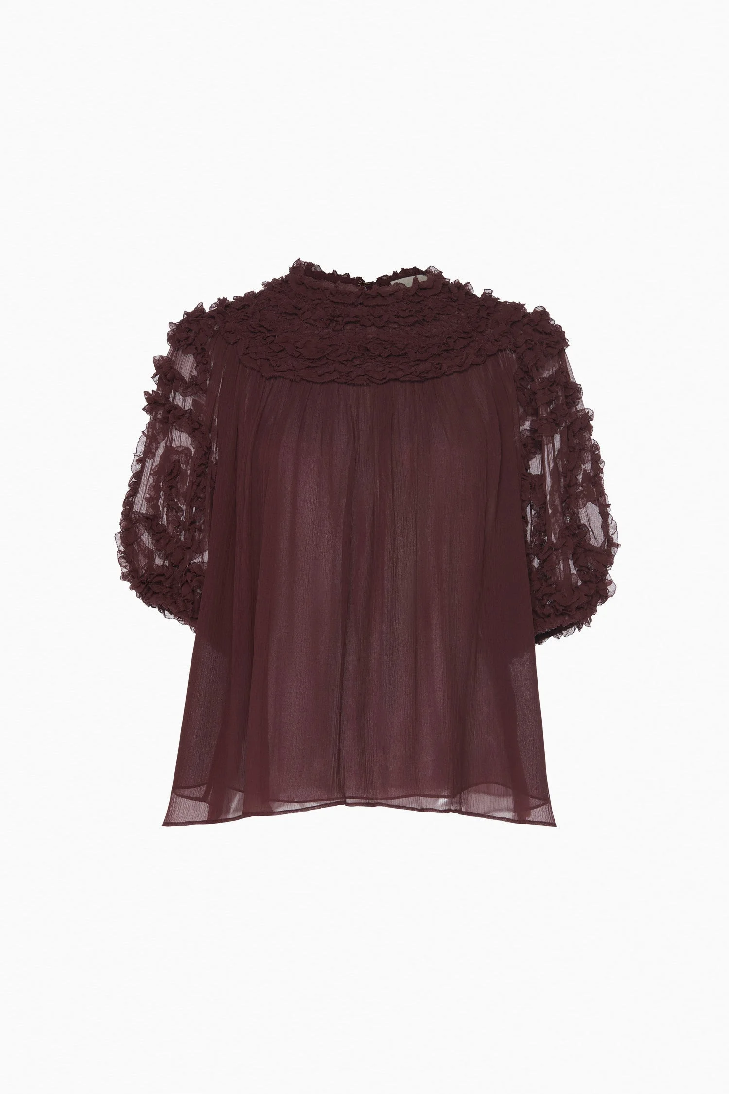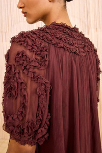 The Isolda Blouse is defined by delicate, micro frills that swirl across the yoke and sleeves. It is cut from whisper-light crinkled chiffon in mahogany red and has a flowy fit that is elegant both tucked or untucked. - Crinkled silk chiffon - Model Height: 5'10" - Designed for a loose fit - Short sleeves with elastic cuffs - Lined in bodice - Concealed zipper along back - Composition: 100% silk - Dry clean only