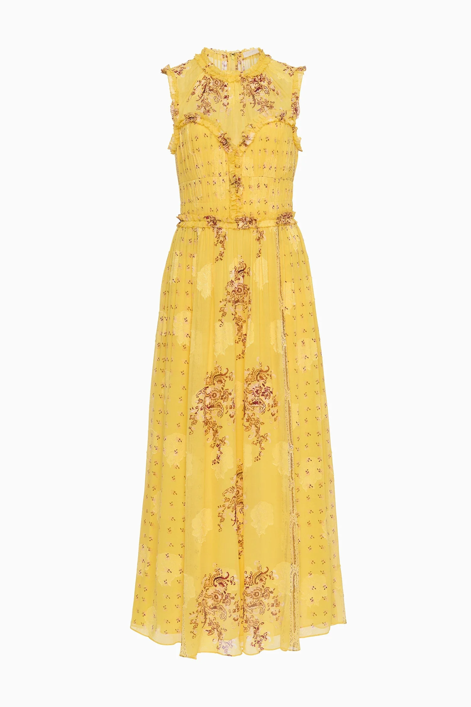 The Kasia Dress is crafted from golden yellow chiffon jacquard with ethereal botanicals, featuring a scarf print layered atop tonal fil coupe blooms. This sleeveless dress is gathered at the bodice and has an elastic waist that transforms into flowy volume at the hemline. It is finished with wispy ruffles and fastens with a concealed back zipper. Composition: 64% Silk, 36% Viscose Size & Fit - Model Height: 5'10" - This midi dress is designed with a fitted bust, elastic waist, and is loose at the hip.