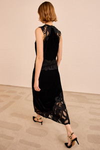 The Kassandra Top is crafted from lightweight black velvet rich in artistic detailing, featuring mesh panels embroidered with floral ribbon motifs. This sleeveless top coordinates with the Alita Skirt for occasions or with denim for relaxed elegance. - Velvet - Model Height: 5'10" - Designed for a slim fit - Sleeveless - Concealed back zipper - Composition: 75% viscose, 25% polyester - Dry clean only