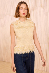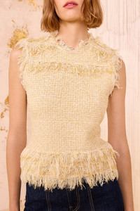 A delicate pale yellow, the Kassi Top is a reinterpretation of classic tweed—lurex and blonde threads are knitted and interlaced with dip-dyed yarns that radiate a subtle gleam. Layers of gestural fringe bring playful dimension to this effortless top. - Knitted tweed - Model Height: 5'10" - Designed for a slim fit - Pullover style - Composition: 64% polyester, 28% viscose, 5% nylon, 3% metallized polyester - Dry clean only