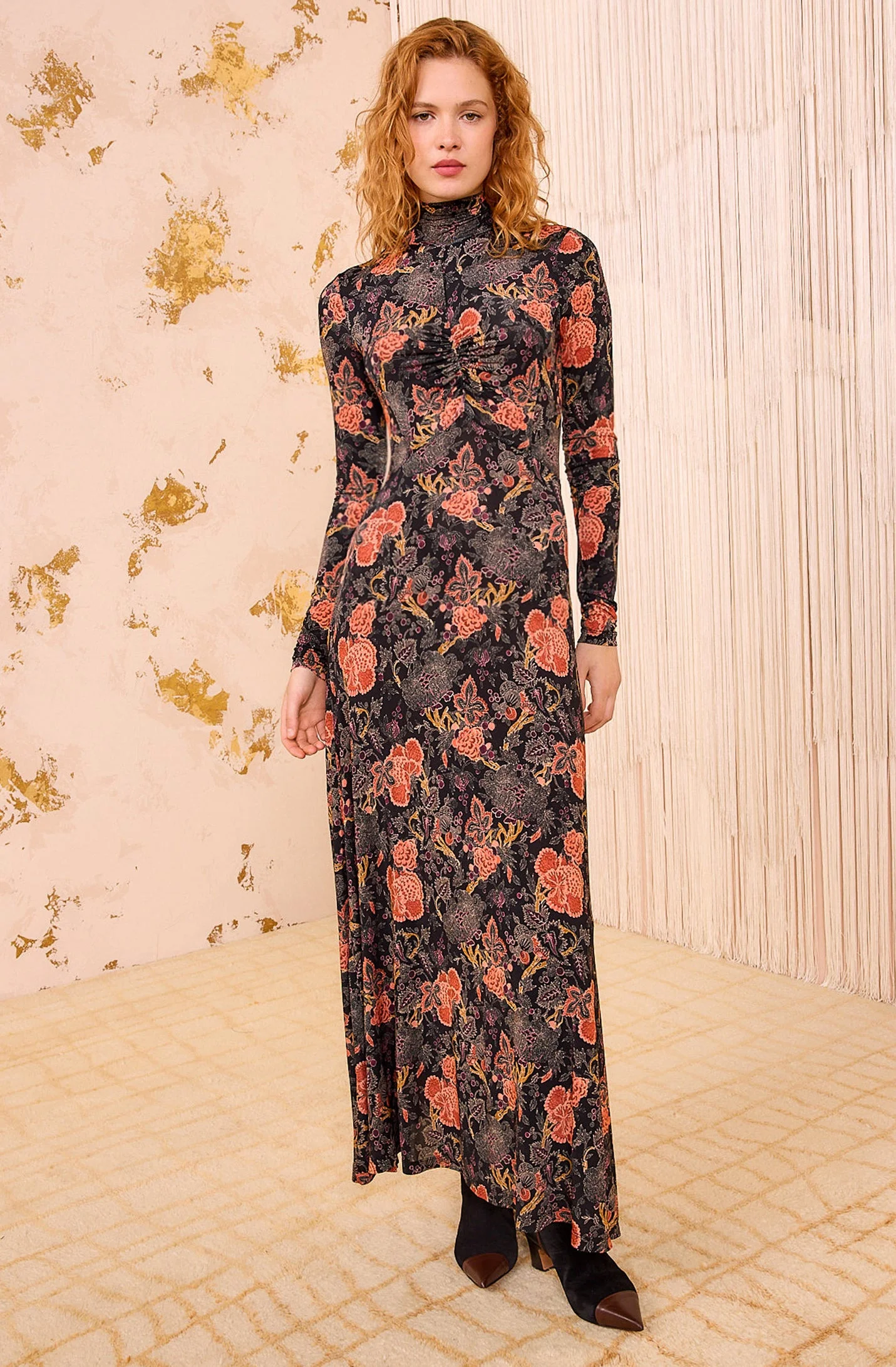 The Koa Dress is crafted from signature tricot jersey adored for its silky-soft feel, patterned with hyper-vibrant florals against a black backdrop. This multicolored dress has a ruched front that lightly sculpts, while the maxi silhouette enhances the form. - Tricot jersey - Model Height: 5'10" - Designed for a close fit, gently flares at the hem. - Maxi length - Turtleneck - Long sleeves - Pullover style - Composition: 91% rayon, 9% elastane - Gentle machine wash