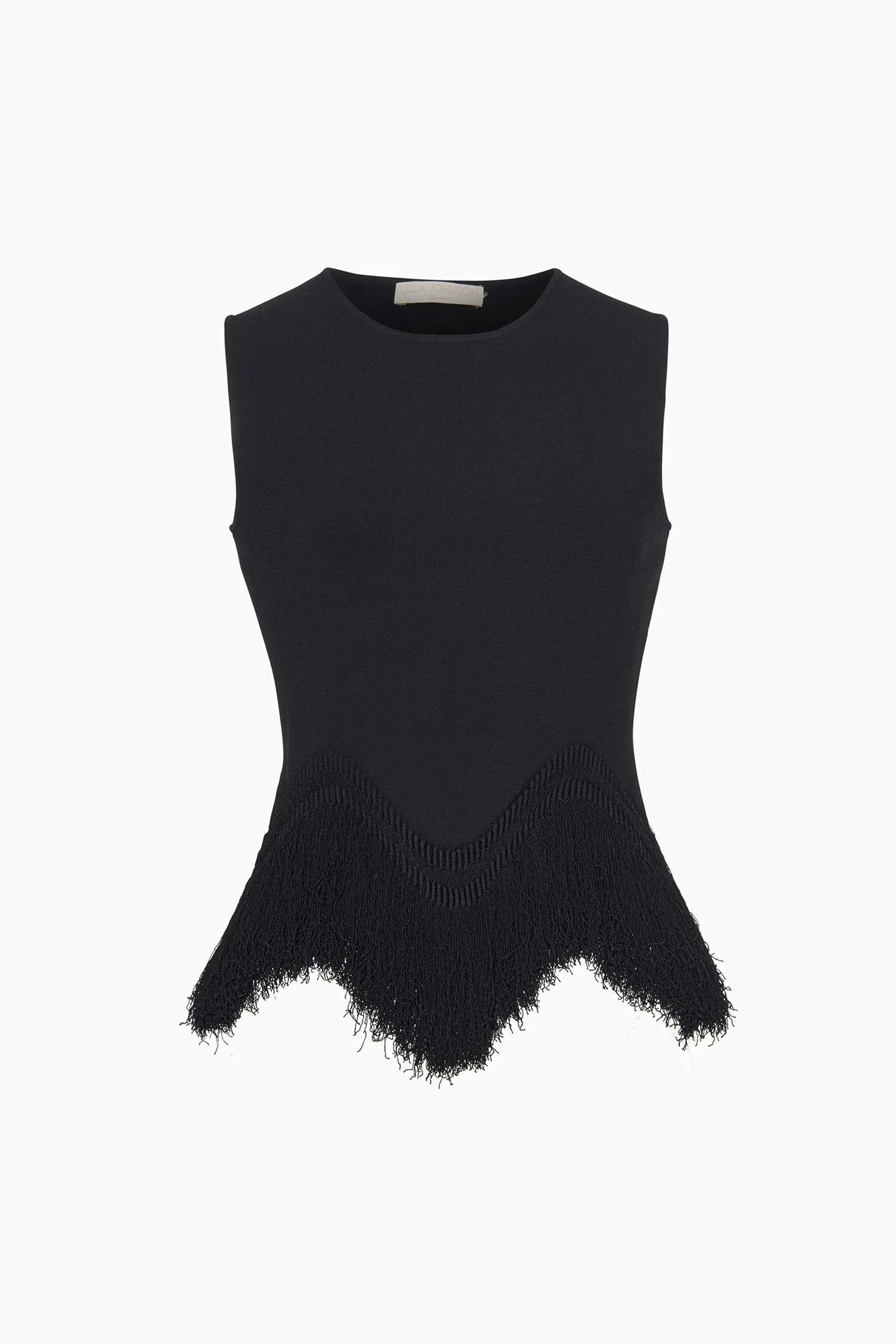 The Koa Top is spun from our signature plush knit with hand-cut fringe along the hemline that adds an artisanal touch. Arriving in perennial black, this top has a slim fit that easily coordinates with denim and tailoring. - Plush fringe knit - Model Height: 5'11" - Designed for a slim fit - Round neckline - Sleeveless - Pullover style - Composition: 83% viscose, 17% polyester - Dry clean only - Style# SP260764