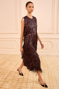 Our Leonie Top has a mahogany red lambskin base that comes alive with dancing tiers of raw-edge fringe. Coordinate with the matching Therese Skirt for playful distinction. - Leather - Model Height: 5'10" - Designed for a boxy fit - Round neckline - Sleeveless - Fully lined - Concealed back zipper - Composition: 100% lambskin leather - Dry clean only by leather specialist