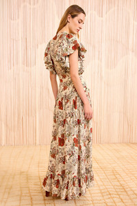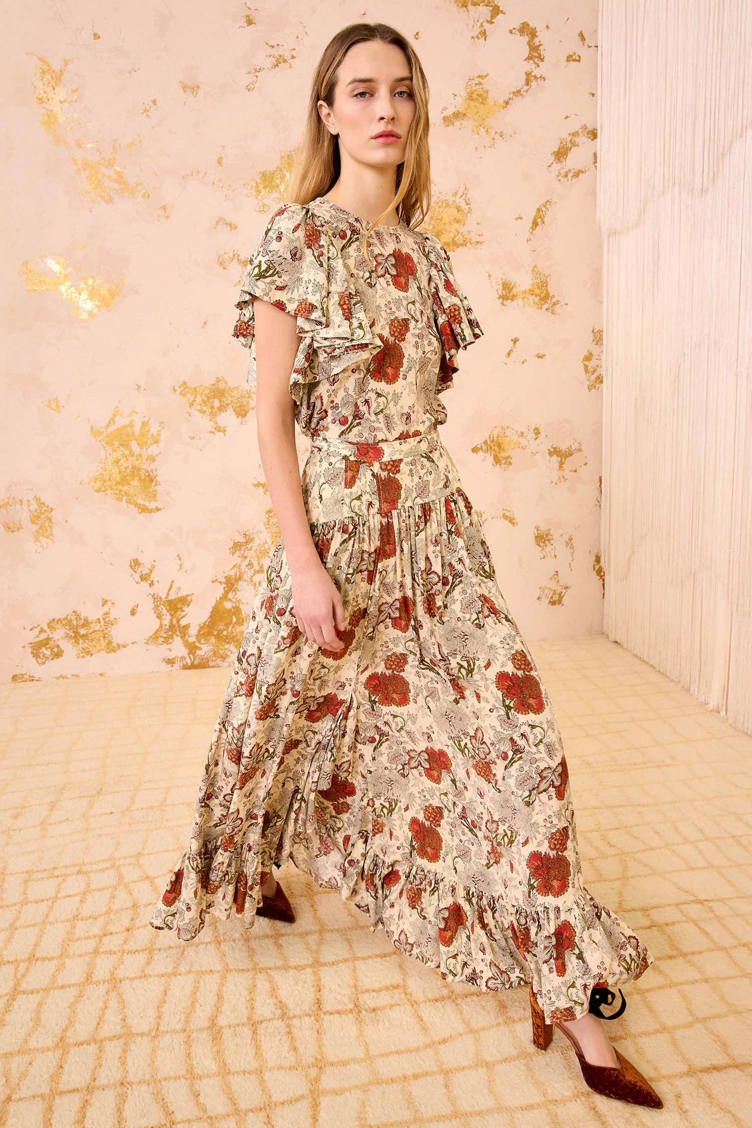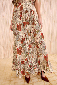 Made from signature silk crepe de chine, the Lilou Skirt is an effortless silhouette with generous gathering that cascades with an asymmetrical ruffle along the front. This multicolored skirt is adorned with florals enriched with graphic engravings, inspired by a French botanical print from the 19th century. - Silk crepe de chine - Model Height: 5'11" - Midi length, fixed high-rise waist - Bias cut - Front slit - Side pockets - Concealed side zipper - Composition: 100% silk - Dry clean only