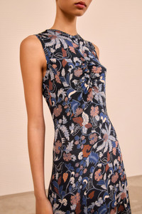 The Lina Dress is adorned with botanicals that vividly contrast against a deep midnight blue. Easy in elegance, this lightweight jersey dress skims the form and is sculpted with delicate ruching at the front. - Tricot jersey - Model Height: 5'10" - Designed for a close fit, gently flares at hem - Midi length - Sleeveless - Pullover style - Composition: 91% rayon, 9% elastane - Gentle machine wash