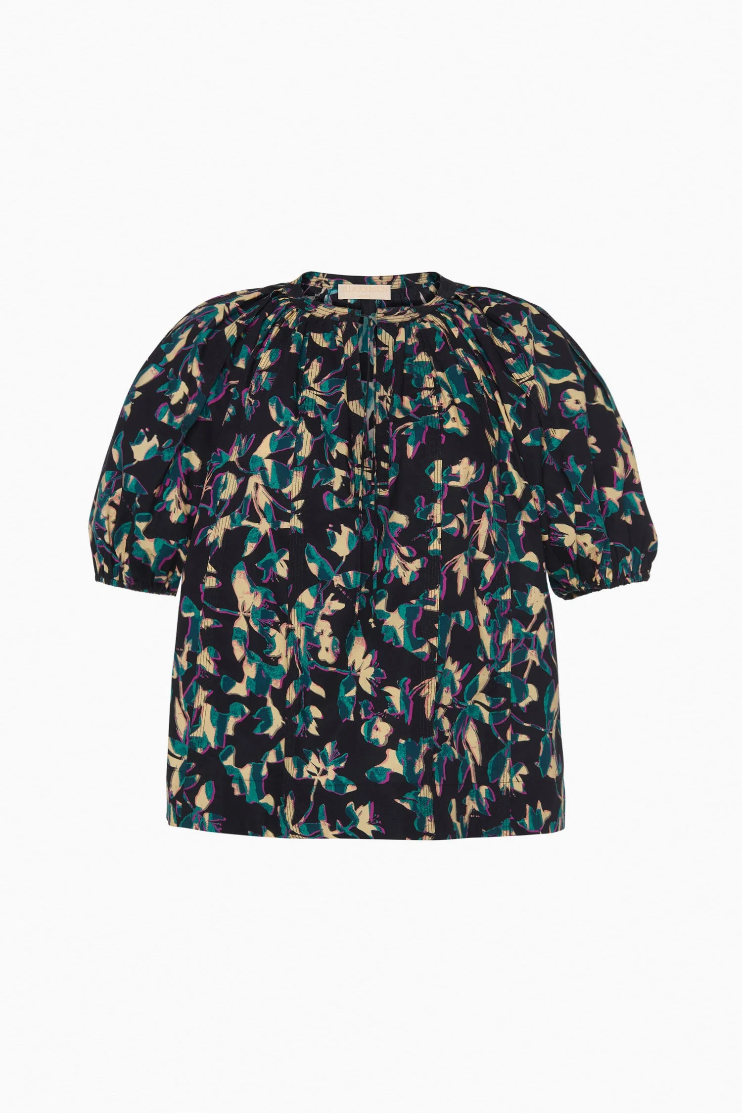 The Loli Blouse is structured from crisp cotton poplin with signature puffed sleeves for added dimension. Alive in green and purple hues, the vibrancy and layered textures of the florals make this top an elevated yet wearable staple. - Cotton poplin - Model Height: 5'11" - Designed for a boxy fit - Short sleeves - Tie-neck keyhole - Composition: 100% cotton - Machine wash cold