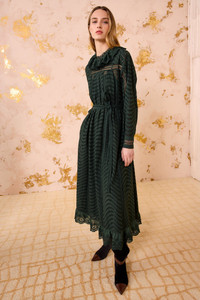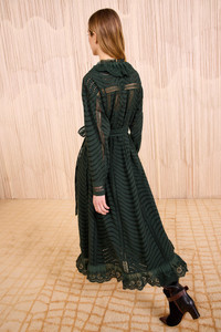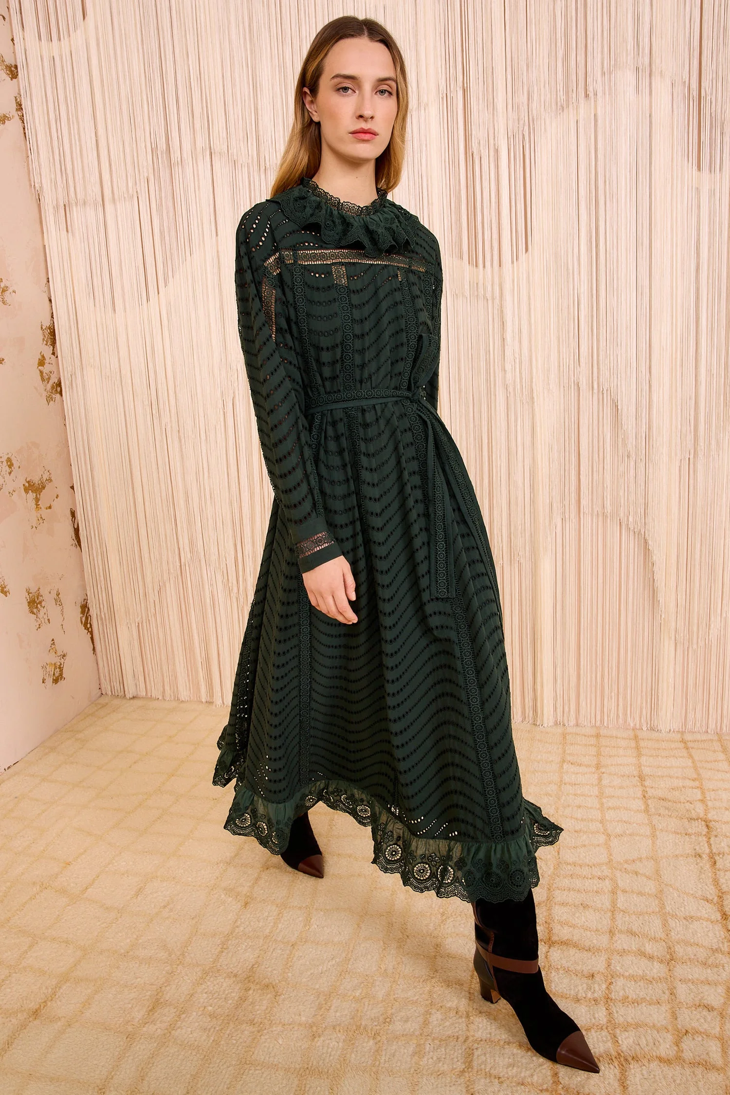 The Lyla Dress is tailored from our signature water-washed poplin, freshly envisioned with degrade eyelets that undulate across the silhouettes. Arriving in deep Cypress green, this dress is adorned with lace inserts and scalloped trims for added dimension. - Water-washed poplin - Model Height: 5'11" - Oversized fit when unbelted. Use tie belt to cinch waist. - Side pockets - Long sleeves with button cuffs - Removable slip - Concealed back zipper - Composition: 100% cotton - Machine wash cold
