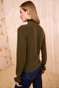 Artful yet refined, the Maisie Turtleneck is an Ulla Johnson signature spun from luxurious cashmere with distinctive ribbing that fans out from the neckline. It is detailed with ties that fasten into a delicate bow and is finished with knitted frills. The green shade ensures it easily coordinates with your wardrobe essentials. - Cashmere knit - Model Height: 5'11" - Designed for a slightly loose fit - Adjustable neck ties - Long sleeves - Pullover style - Composition: 100% cashmere - Dry clean only