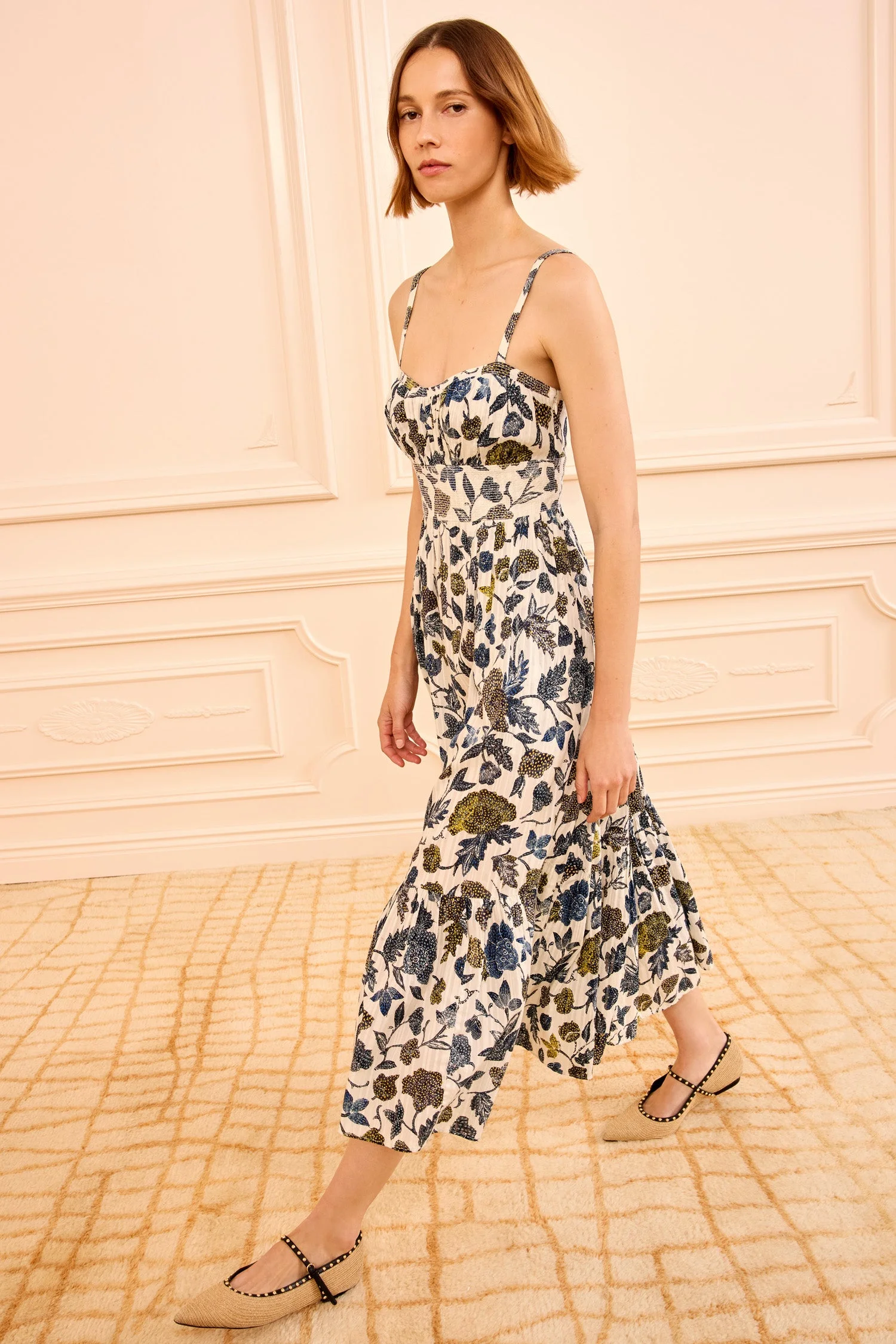 The Nadine Dress is adorned with a textured, batik floral print set atop subtle stripes. This wear-anywhere, multicolored dress is made from cotton-blend with a sweetheart neckline that flatters the form and floats to a midi hemline. - Shadow stripe cotton-blend - Model Height: 5'10" - Designed to be fitted at the bust and waist, loose at the hip - Midi length - V-neckline with ties - Flutter sleeves - Side pockets - Concealed side zipper - Composition: 66% cotton, 34% viscose - Gentle machine wash