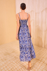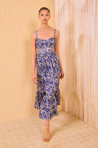 Inspired by a vintage indigo panel, the Nadine Dress is richly adorned with graphic florals against soft, tonal stripes. This multicolored sleeveless dress is made from a lightweight cotton-blend with a sweetheart neckline, fixed waist, and floats to a midi hemline. It fastens with a concealed side zipper. Composition: 66% Cotton, 34% Viscose Size & Fit - Model Height: 5'10"