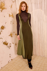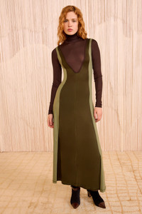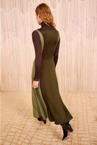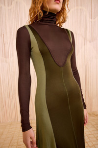 Debuting in Look 49 on the AW25 runway, the Nahla Dress features a sleek silhouette with a collage of textures in smooth and ribbed jersey. This surface-rich, dark green dress is patchworked to create the illusion of a V-neckline and is finished with sportif cover stitching. - Jersey - Model Height: 5'11" - Designed for a close fit, flares at hem - Turtleneck - Long sleeves - Pullover style - Composition: shell 100% viscose; combo 97% viscose, 3% elastane - Machine wash or dry clean