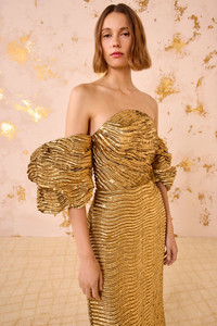 Closing the AW25 runway in Look 58, the Nisha Gown is a standout piece sculpted from Italian cloque fabric defined by wave-like textures that flicker at every step. This striking, gold gown features a modern, rounded neckline framed by voluminous puffed sleeves that drape gracefully off the shoulder. - Metallic cloque - Model Height: 5'11" - Designed for a close, structured fit. - Strapless gown - Side split - Bodice has internal waist belt with hooks for adjustability. - Back zipper - Composition: 46% pure copper metallic yarn, 20% metallized polyester, 16% polyester, 8% acrylic, 7% silk, 3% polyamide - Delicate dry clean