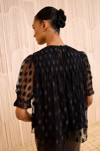 Alive in texture, the Nitara Blouse is crafted from a diaphanous, cotton-blend lace adorned with polka dots that playfully unveil. It is artfully crafted with puffed shoulders and is black for wear-everywhere elegance. - Dotted cotton-blend lace - Model Height: 5'10" - Designed for a loose fit - Short sleeves with elastic cuffs - Silk lining in bodice - Button keyhole at back - Composition: 60% polyamide, 40% cotton - Hand wash or dry clean
