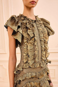 The Ondine Dress breathes with gesture created by a point d’esprit knit applied with swathes of wavy ruffles inspired by Chantilly lace. This gold, event-ready dress skims the form and is underpinned with a slip lining. - Point d’esprit and Chantilly lace knit - Model Height: 5'10" - Designed for a slim fit - Midi length - Flutter sleeves - Slip lining - Mother-of-pearl button keyhole at back