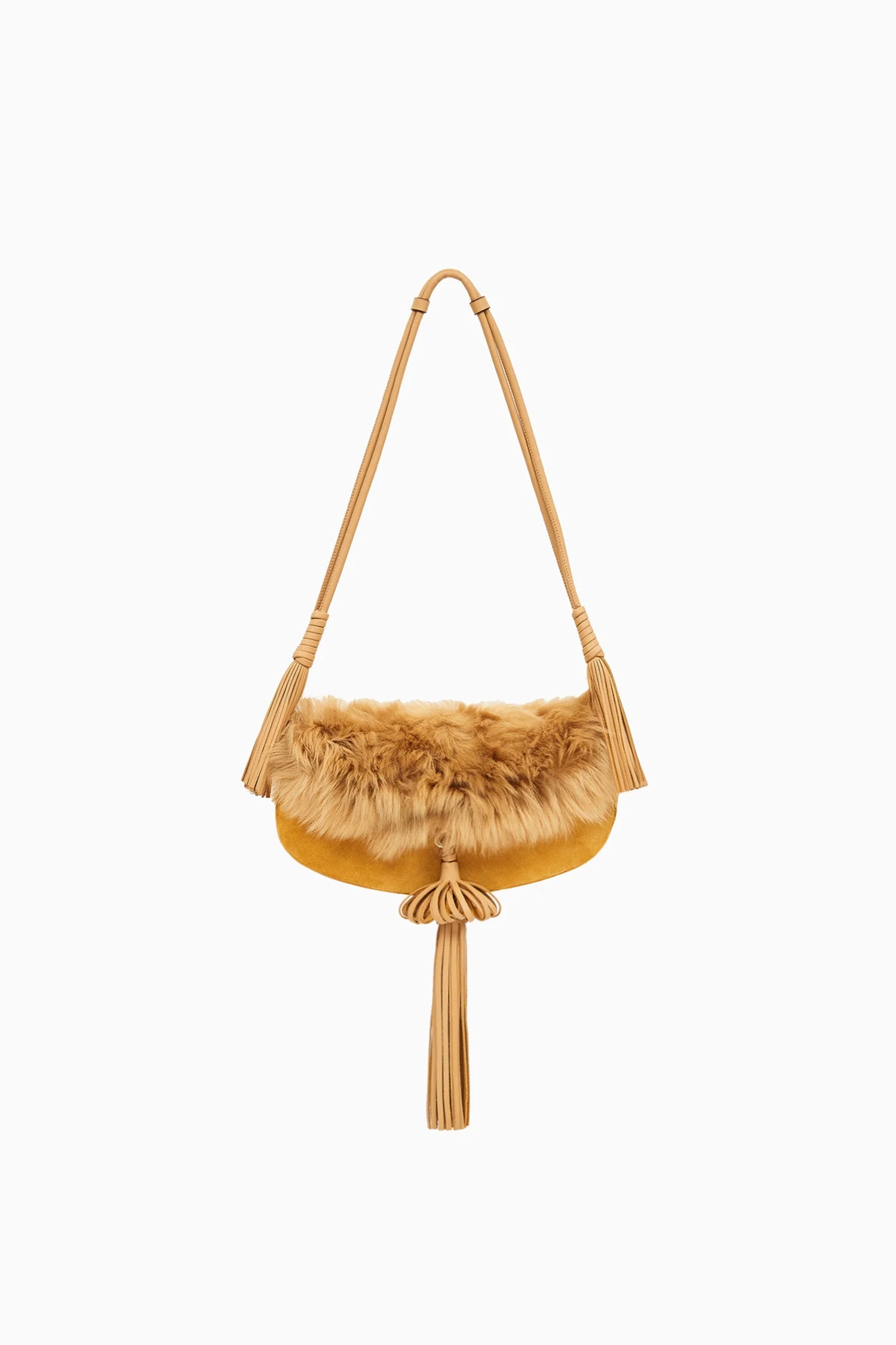 Debuting on the AW25 runway, the Paloma Bag is the newest addition to the Ulla Johnson handbag lineup, made in Italy from a blend of plush shearling and suede in a warm yellow hue. This artful silhouette features a modern take on the classic tassel, which adorns the adjustable straps and front flap, functioning as the perfect day-to-night bag—remove the straps to carry elegantly under the arm. - Height: 5.7 in / Length: 9.8 in / Depth: 2.6 in - Handle drop: 5.5 in shortest, 14.6 in longest - Shearling and suede - Made in Italy - Nappa leather lining - Vintage gold hardware - Clasp closure Size & Fit Find your size with our .