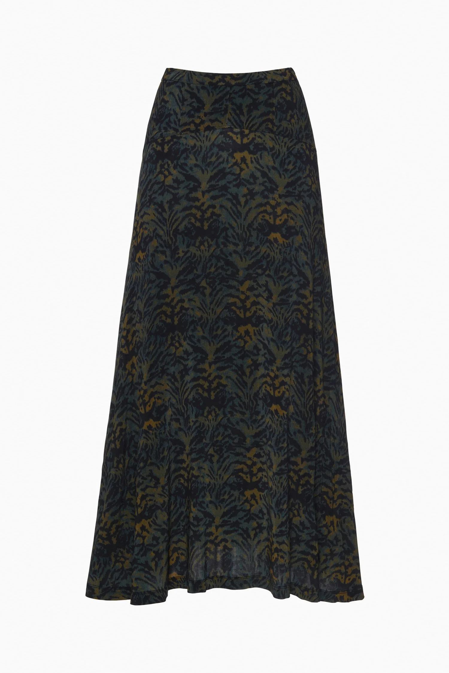 Timeless in form, the Paola Skirt is a wardrobe staple saturated with ikat motifs evocative of a lush, animal print. Spun from silken tricot jersey, this multicolored style has a classic A-line cut that skims the form to a slightly flared hemline. - Tricot jersey - Model Height: 5'10" - Midi length, fixed high-rise waist - Concealed side zipper - Composition: 91% rayon, 9% elastane - Gentle machine wash