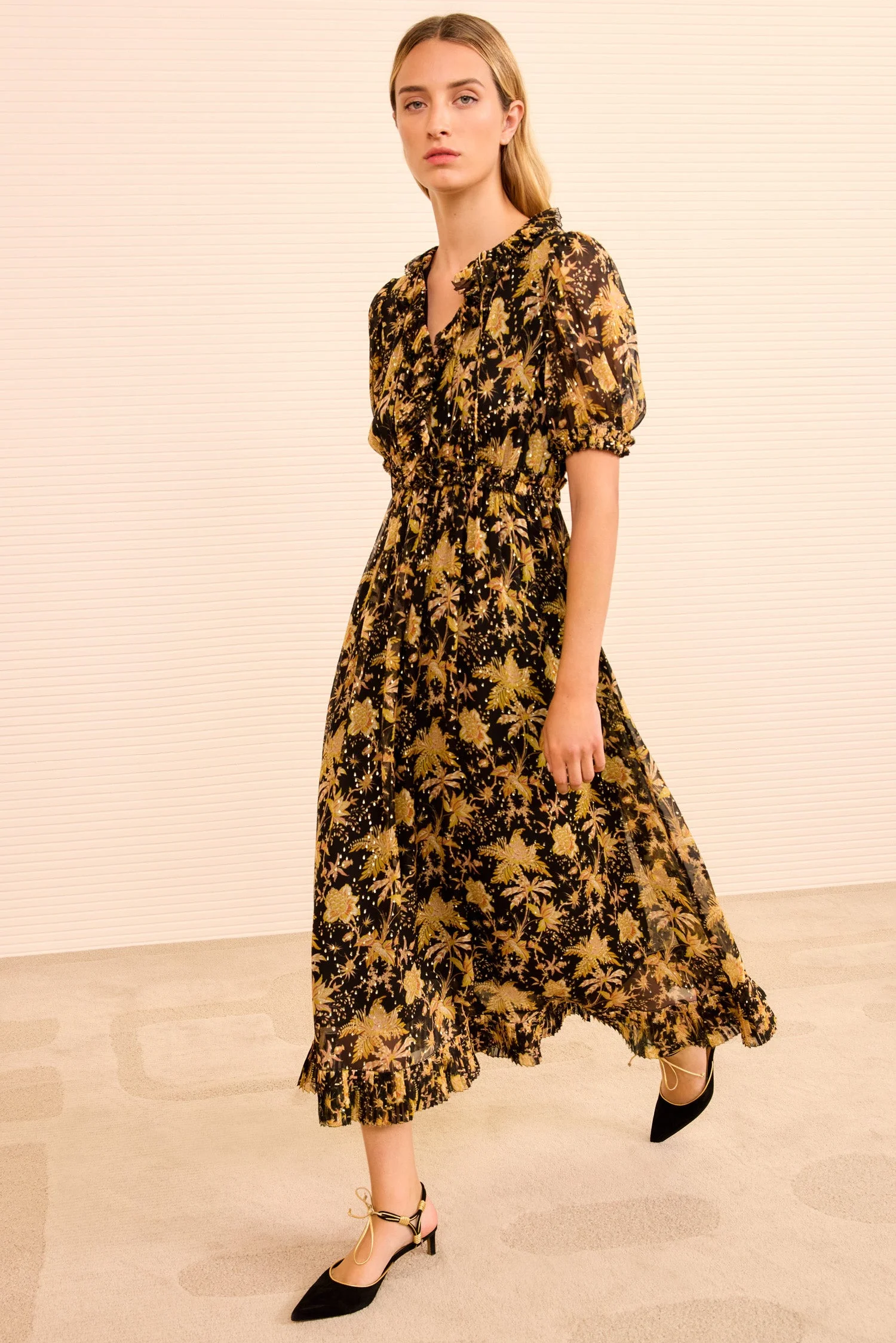 The Rosamunde Dress is crafted from lightweight chiffon rich in dialogue, featuring palm botanicals and metallic dots layered throughout. This multicolored dress features signature puffed shoulders and is finished with gestural, pleated ruffles and a handkerchief hem. - Metallic fil coupe chiffon - Model Height: 5'11" - V-neckline with ties - Puffed short sleeves with elastic cuffs - Lined - Concealed side zipper - Composition: 91% silk, 9% metalized polyester - Dry clean only
