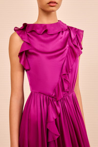 The Saanvi Dres whispers soft elegance—it is crafted from vivid pink silk chiffon with a satin finish and is artfully draped across the bodice and finished with cascading ruffles. - Satin-faced silk chiffon - Model Height: 5'10" - Midi length - Lined - Concealed side zipper - Composition: 100% silk - Dry clean only