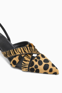 Crafted in Italy, the Tahlia Heel is an effortless kitten style elevated with an intricately woven upper in sumptuous calf hair. Resting on a 2.17" or 55mm heel, this animal-print shoe has a pointed toe and easily slips on with a leather slingback that has internal elastic. Composition: 100% Leather and Calf Hair
