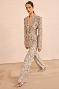 The Tess Jacket is masterfully cut from linen suiting with brushstroke textures, created by slubbed yarns in a melange of gray and neutral hues. This elevated blazer features bold shoulders contrasted by a nipped waist and coordinates with the Blanca Pant for tailored refinement. - Italian linen suiting - Model Height: 5'10" - Peak lapels - Long sleeves with padded shoulders - Front flap pockets - Single-breasted button front - Composition: 43% linen, 32% cotton, 14% polyester, 11% viscose - Delicate clean only