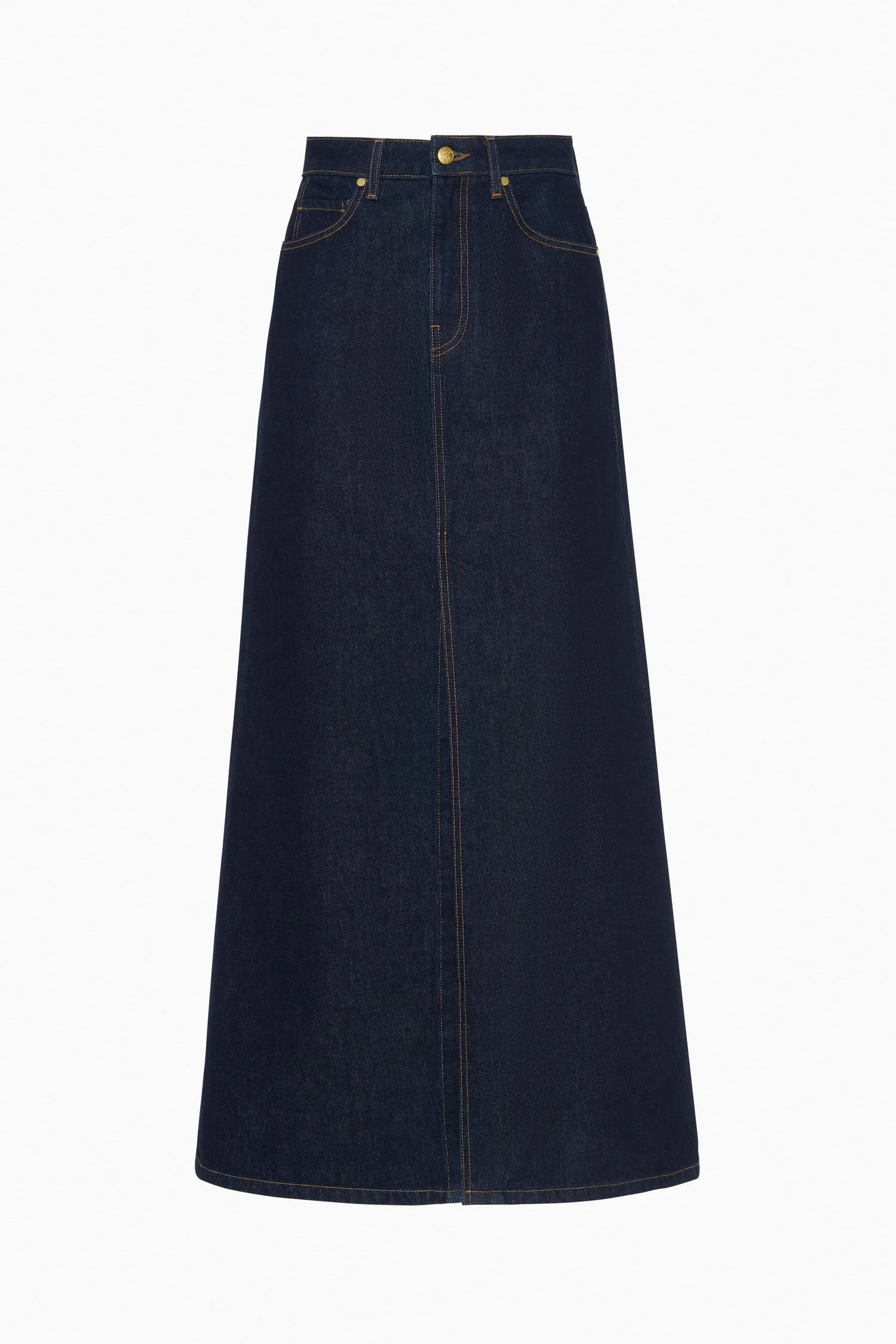 The Anais Skirt is handcrafted from premium denim in a deep indigo reminiscent of vintage styles. This classic denim skirt features an elongated, A-line silhouette and has front and back splits for graceful movement. - Non-stretch denim - Handcrafted in Los Angeles - Model Height: 5'11" - Maxi length, fixed mid-rise waist - Five-pocket construction - Signature monogram leather patch and hand-hammered ring - Front button and concealed zipper - Composition: 100% cotton - Machine wash cold