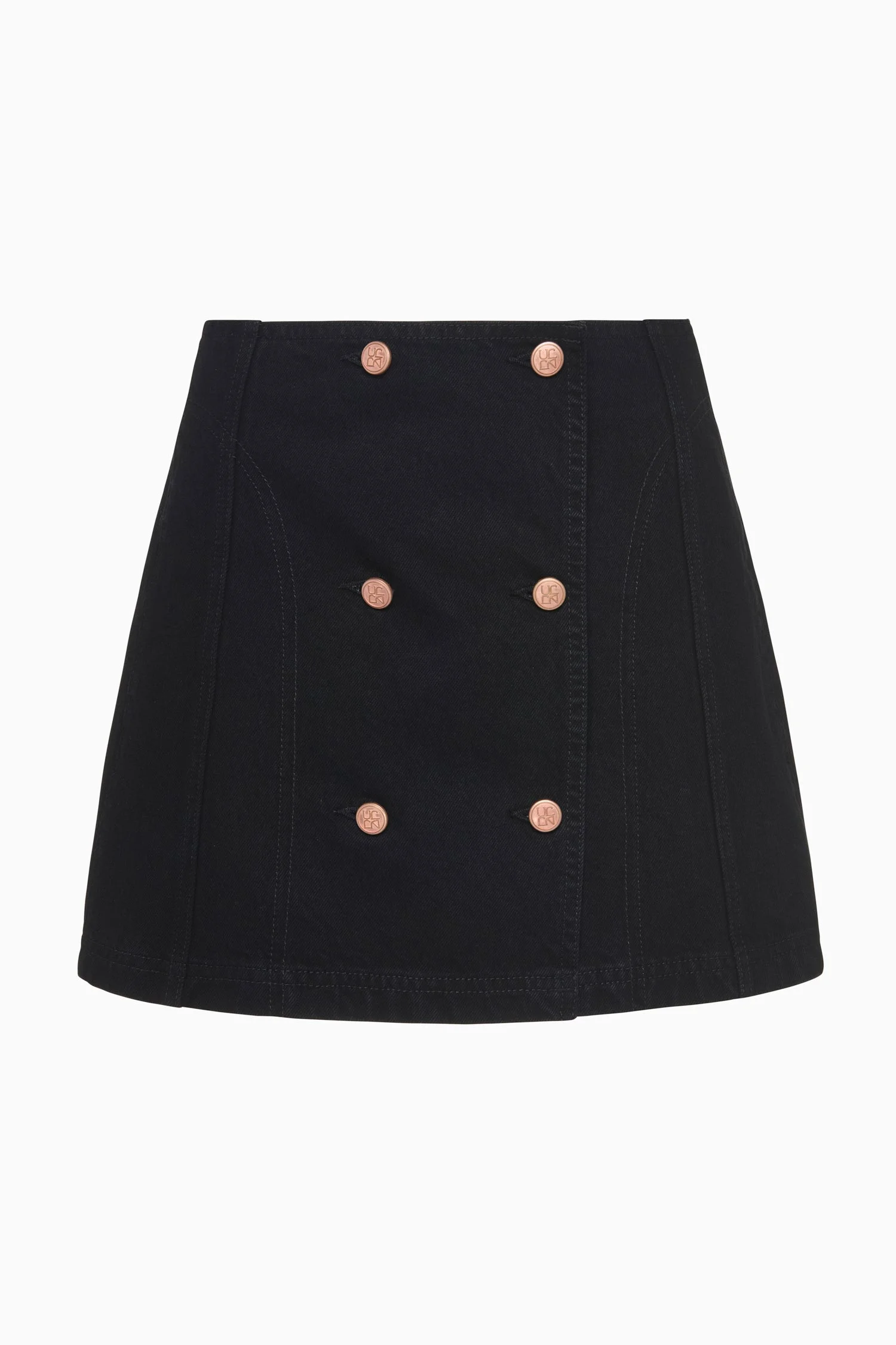 The Clara reinterprets the classic mini skirt, responsibly handmade in Los Angeles in a wear-everywhere black wash. This mini denim skirt fastens with a placket through the front that references vintage styles, while the monogram-adorned buttons add an elevated touch. - Non-stretch denim - Handcrafted in Los Angeles - Model Height: 5'10" - Mini length, designed to be worn just below the natural waist - Signature monogram buttons through front - Composition: 100% cotton - Machine wash cold