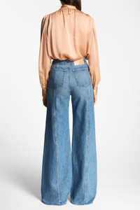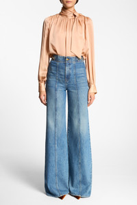 The Delphine Jean is the newest addition to the Ulla Johnson denim lineup. The medium indigo wash provides timeless versatility, while the Hollywood waistband creates a clean finish. Custom twisted gold hardware finishes this elevated essential. - Non-stretch denim - Handcrafted in Los Angeles - Model Height: 5'11" - High-rise, flared leg - Back pockets - Inseam: 33 - Signature monogram leather patch and hand-hammered ring - Front button and concealed zipper - Composition: 100% cotton - Machine wash cold
