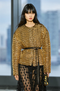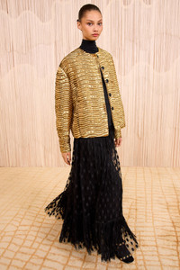 Debuting in Look 12 on the AW25 runway, the Veeda Jacket is a sculptural silhouette crafted from Italian cloque fabric with wave-like textures that flicker with movement. This striking gold jacket features a relaxed yet structured fit, with a modern collarless neckline and elegantly voluminous sleeves. - Metallic cloque - Model Height: 5'10" - Designed for a boxy fit - Side pockets - Concealed snap closures through front - Composition: 46% pure copper metallic yarn, 20% metallized polyester, 16% polyester, 8% acrylic, 7% silk, 3% polyamide - Delicate dry clean - Tassel belt for styling and not included with dress