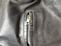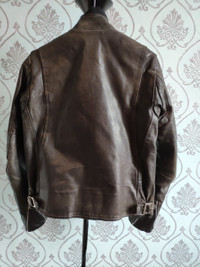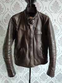 10/10 Archive handmade biker leather jacket by Golden Goose Venezia Heavyweight jacket with "Utility cloth" tag - looks like real biker jacket from 1940-50 with new lining. Comes with original insulated zip vest. Tag size S - runs XXS, ask msrmnts Made in Italy RRP - 1600$ Shoulders - 14 1/2 inch laid flat P to P - 18 inch Sleeve - 24 inch Back length w/o collar - 23 inch Check my other listings!