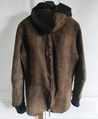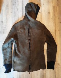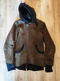 8/10. Check pics - great condition. Worn a few. One dry clean. Unique viking shearling coat by DIONISO. Sold out everywhere - now Dioniso produce only sneakers. Raw edges, fullzip backside, two type of buttons, warm & lightweight, leather stitches, mitten type pockets, wool sleeve end. Tag size 50, but runs smaller - to M or S Shoulders - 19 1/2 inch laid flat P to P - 23 inch laid flat Sleeve - 26 inch + wool sleeve Back length w/o hood - 31 inch Handmade in Italy RRP - 1100$ Check my other listings!
