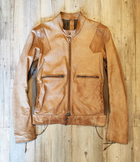 Condition 7/10 - worn a few. No stains - just used. Sold out everywhere. Brand closed. Rare and unique Brown mixed leather cafe racer jacket by Jan & Carlos Amazing fut, leather laces on sleeves & back, RIRI zips. Tag size 50 - runs S - M Shoulders - 18 1/2 inch laid flat P to P - 21 inch Sleeve - 26 1/2 inch Back length w/o collar - 28 1/2 Made in Italy RRP - 1100$ Check my other listings!!!!!