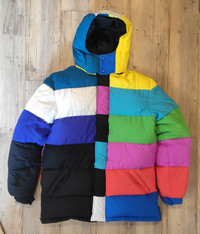10/10 - as new. One photo session - check pics! RARE and UNIQUE TV color bars puffer from first collab Jeremy Scott for ADIDAS Sold out worldwide - never find in the same condition! Detachable hood, side zippes, unique fit! Tag size L - runs from S to L oversized Shoulders - 22 inch laid flat P to P - 25 inch laid flat Sleeve - 26 inch Back length w/o collar - 34 inch Check my other listings!!!!