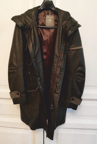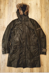 6/10 - worn a few. Olive waxed leather detail long parka from PREVIEW Milano. Tag size 48 - runs S - M Windproof, waterproof, 7 pockets, lightweight (check composition), removable faux fur removable trim, anatomical sleeves Made in Italy RRP - 560$ Check my other listings!!!