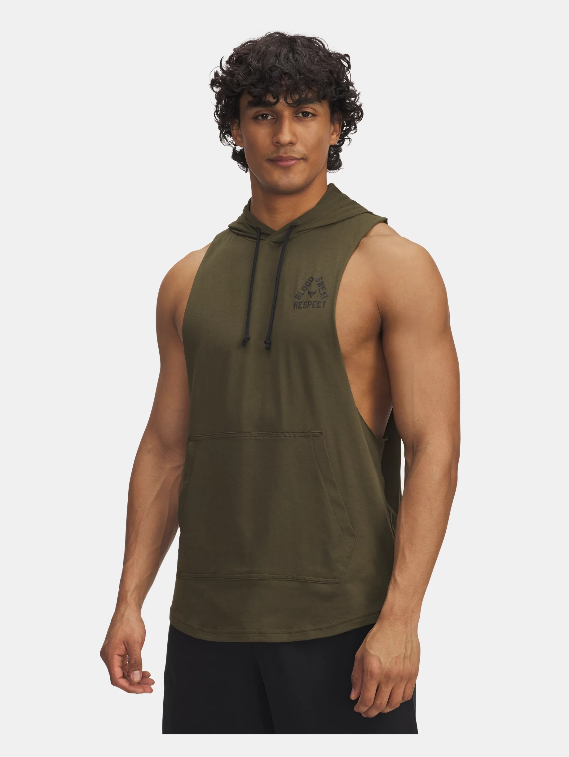 Project Rock training gear was built to help you find boundaries, then push right through them.This sleeveless hoodie was personally approved by Dwayne Johnson, the hardest worker in the room. ANY room. Product Details - Super-soft, cotton-blend fabric provides all-day comfort - Front kangaroo pocket - Shaped hem for enhanced coverage - Generous dropped armholes for full range of motion - Main body fabric contains at least 40% recycled polyester, excluding trims & embellishments Size & Fit - Fuller cut for complete comfort. Space & Care - Style #: 6005049 - 60% Cotton/40% Polyester - Imported