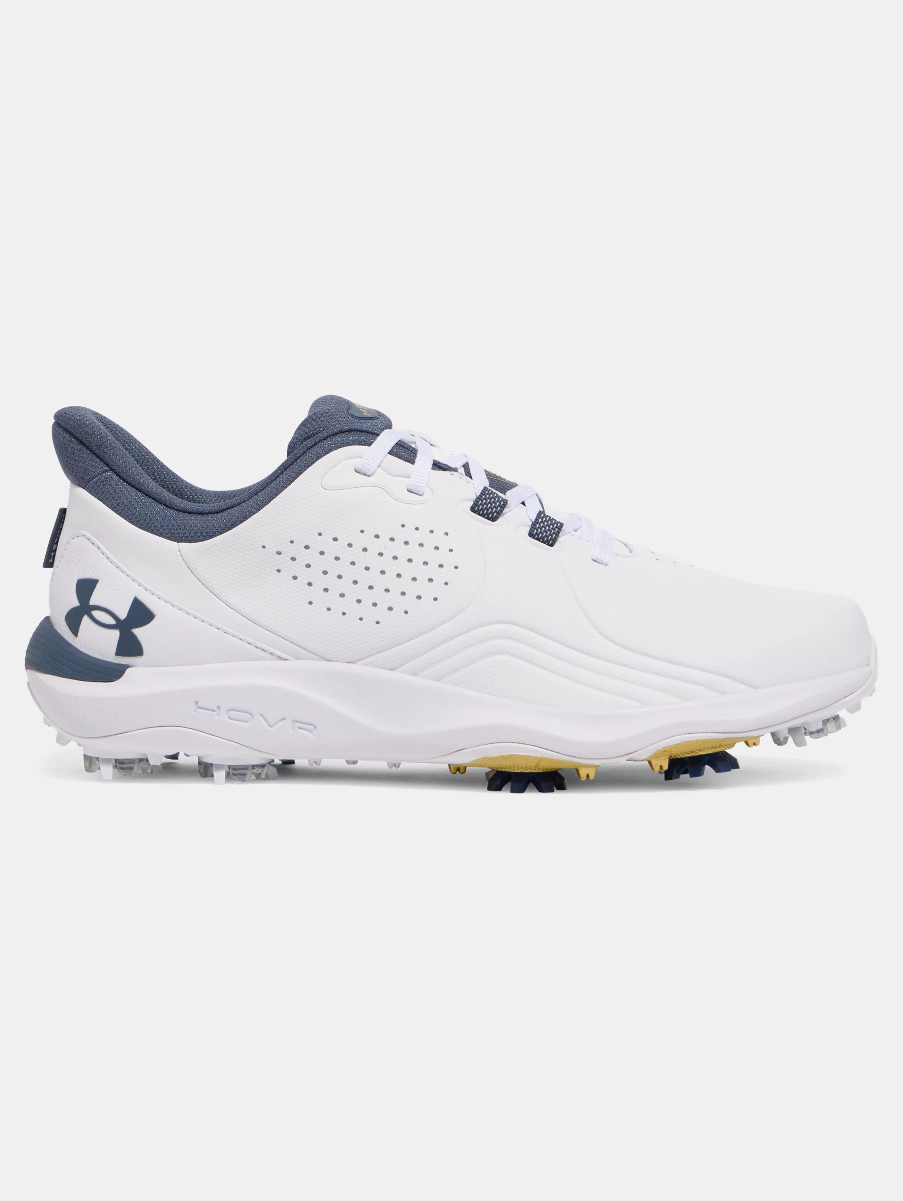 The new UA Drive Pro golf shoes are biomechanically engineered, and lab tested, to provide the traction, and diagonal and lateral support your feet need to unlock the power of your natural swing. Product Details - UA Swing Support System (S3) provides smarter traction, dual-foam cushioning & lockdown lacing - Swing Support Strap combines with reinforcement in the upper to provide biomechanically correct lock-in - Energy-returning UA HOVR™ foam + supportive Charged Cushioning® guides natural motion of the foot in a golf swing - New UA S3 spikes—designed with Softspikes® & a golf biomechanist—for game-changing directional traction - Outsole has strategic flex grooves, secondary traction & TPU up the side for added support at impact - Updated fit with more room at the ball of the foot for improved comfort & stability - Breathable, supportive engineered microfiber upper & full waterproof membrane with 1-year warranty - Molded sockliner for enhanced fit & comfort Size & Fit - Wide Space & Care - Style #: 3026919 - 1 year waterproof warranty - Weight: 12.5 oz. - Lace type: Standard tie - Imported - E Sizing built to better fit athletes with wide feet