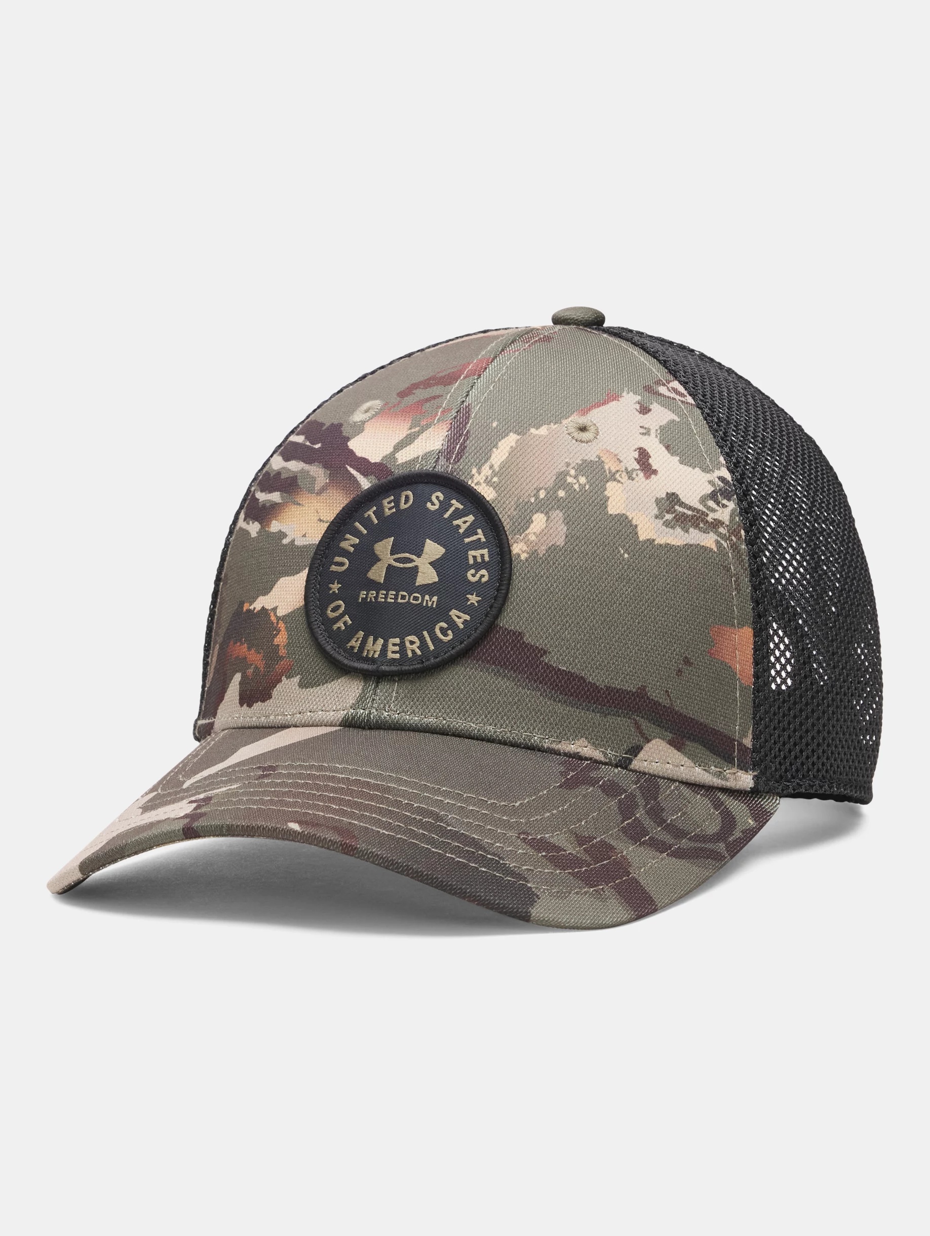 UA Freedom's goal is to support and inspire the brave men and women dedicated to protecting us, every day. This trucker hat is breathable, comfortable, and keeps the sun off your face. Product Details - UA Mid: Modern square mid-crown with structured front panel—sits slightly higher, just off the head - Textured knit fabric is super-soft for all day comfort - Trucker mesh side & back panels deliver added ventilation - Adjustable snapback closure Size & Fit - Adjustable Space & Care - Style #: 6003571 - Front patch logo - 100% Polyester - Imported