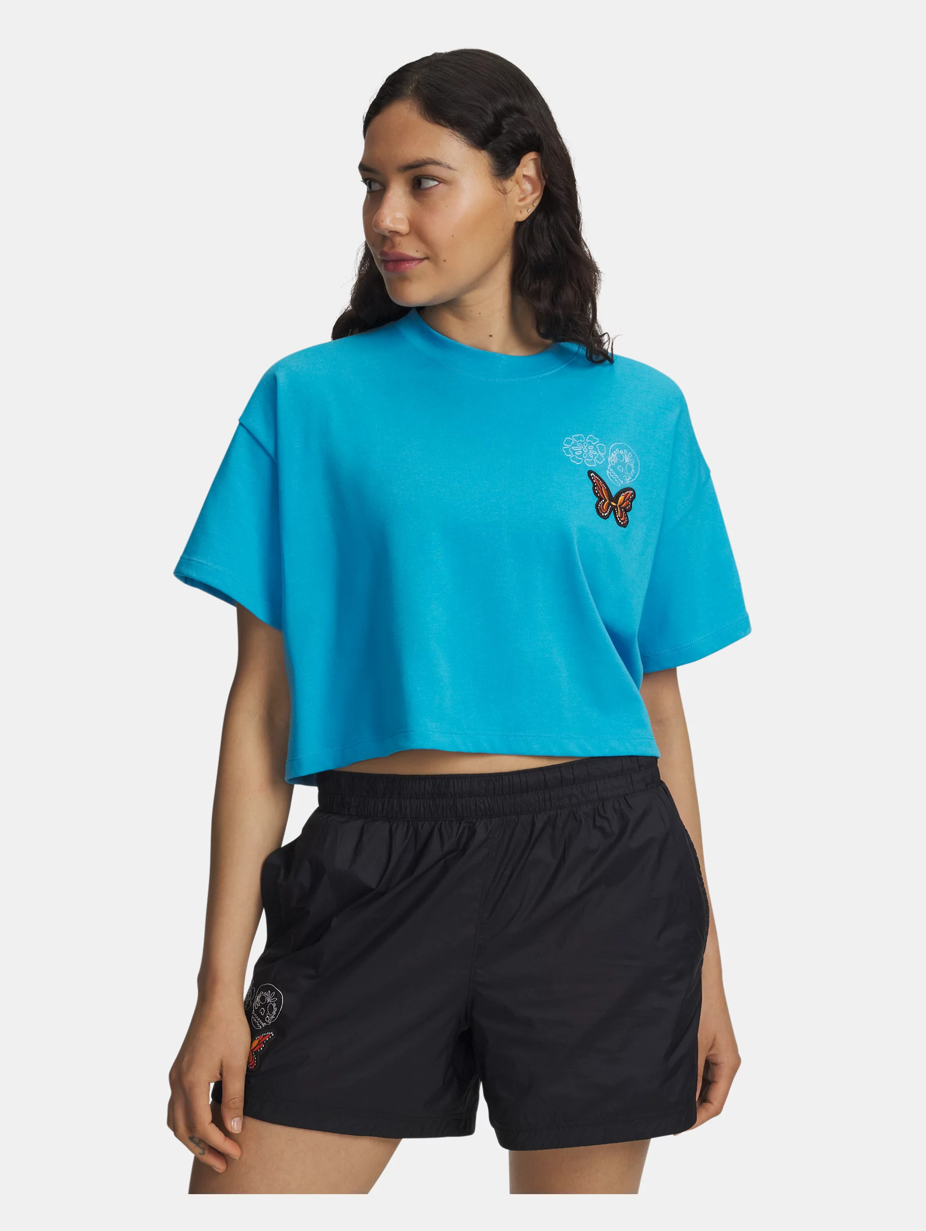 Everyone makes graphic Ts...but Under Armour makes them better.This heavyweight cropped shirt has a more substantial feel but is still super-soft and comfortable and celebrates the Day Of The Dead holiday. Product Details - Heavyweight, soft cotton-blend fabric provides all-day comfort - Ribbed collar - Drop hem shoulder for oversized fit & feel - Cropped body length - Main body fabric contains at least 40% recycled polyester, excluding trims & embellishments Size & Fit - Fuller cut for complete comfort. Space & Care - Style #: 6005936 - 60% Cotton/40% Polyester - Imported