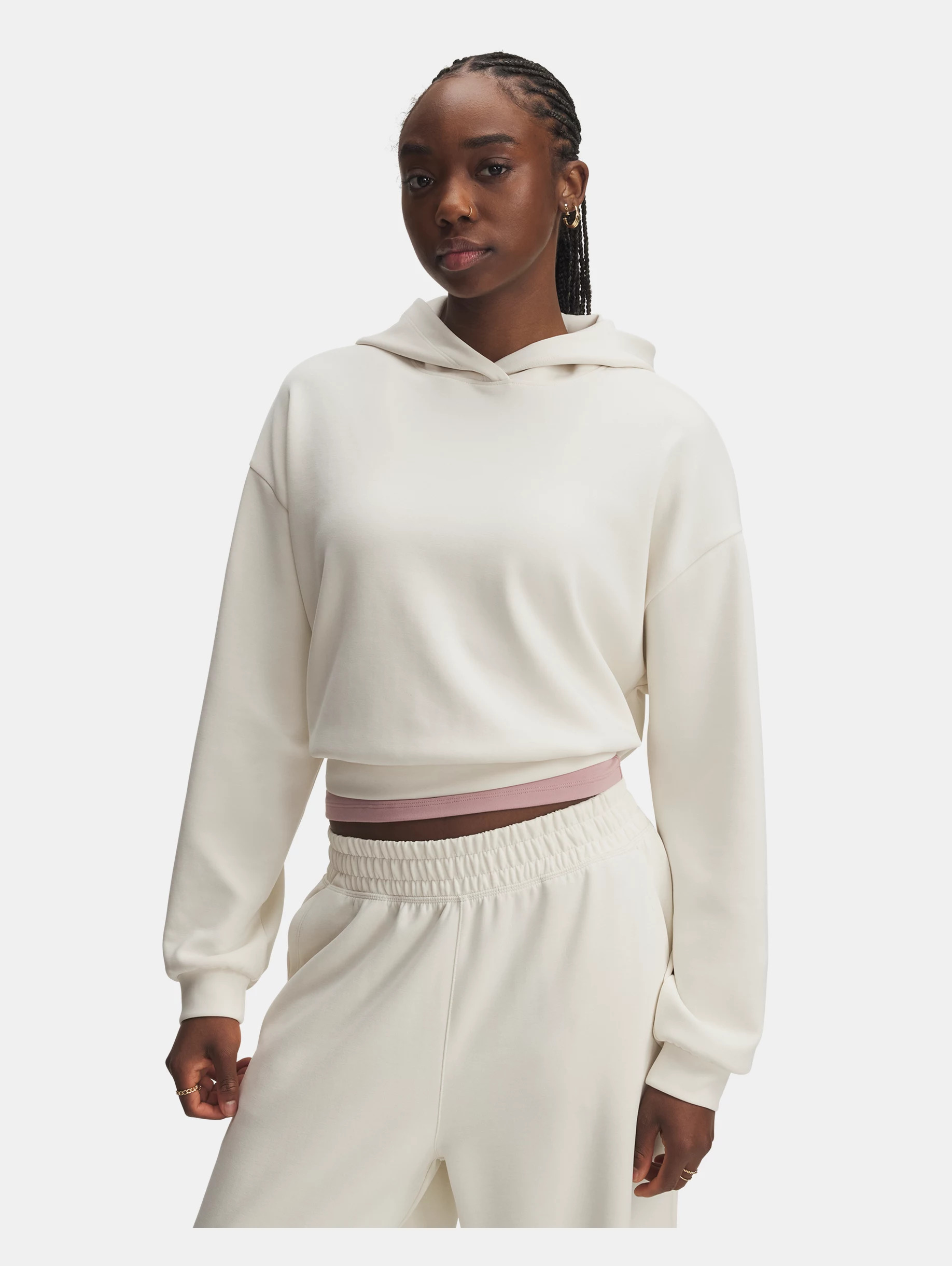 UA Meridian staples are not only ultra soft, they're also light, quick-drying, and designed to flatter your body. Updated with a relaxed fit and premium fabric—you'll literally wear this hoodie everywhere. Product Details - Super-soft, lux knit fabric with a sanded finish is ultra cozy - 4-way stretch material moves better in every direction - Drop hem shoulder & cropped body length Size & Fit - Fuller cut for complete comfort. Space & Care - Style #: 6004004 - 53% Polyester/37% Modal/10% Elastane - Imported