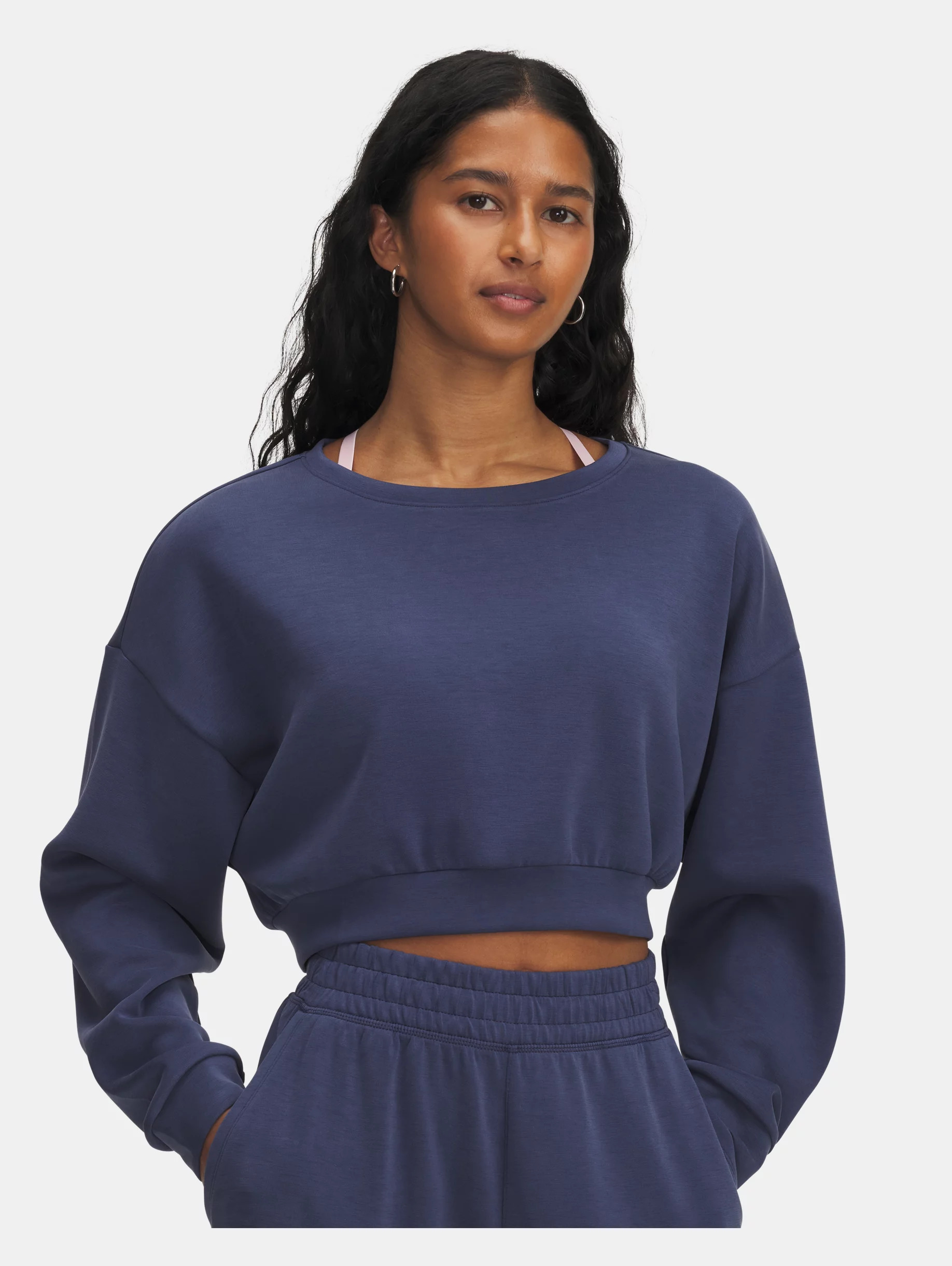 UA Meridian staples are not only ultra soft, they're also light, quick-drying, and designed to flatter your body. Updated with a relaxed fit and premium fabric—you'll literally wear this crewneck everywhere. Product Details - Super-soft, lux knit fabric with a sanded finish is ultra cozy - 4-way stretch material moves better in every direction - Drop hem shoulder & cropped body length Size & Fit - Fuller cut for complete comfort. Space & Care - Style #: 6004006 - 53% Polyester/37% Modal/10% Elastane - Imported