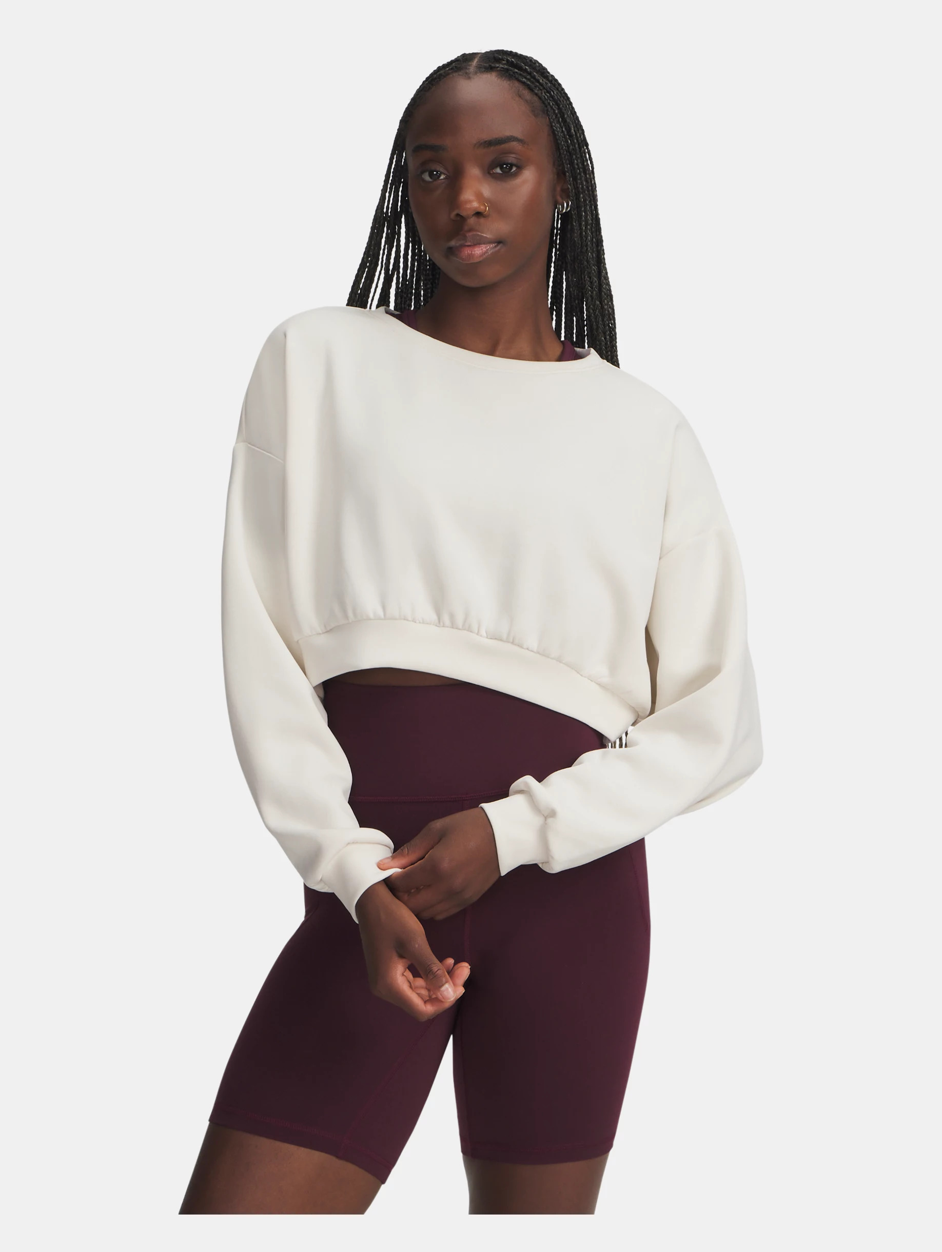UA Meridian staples are not only ultra soft, they're also light, quick-drying, and designed to flatter your body. Updated with a relaxed fit and premium fabric—you'll literally wear this crewneck everywhere. Product Details - Super-soft, lux knit fabric with a sanded finish is ultra cozy - 4-way stretch material moves better in every direction - Drop hem shoulder & cropped body length Size & Fit - Fuller cut for complete comfort. Space & Care - Style #: 6004006 - 53% Polyester/37% Modal/10% Elastane - Imported
