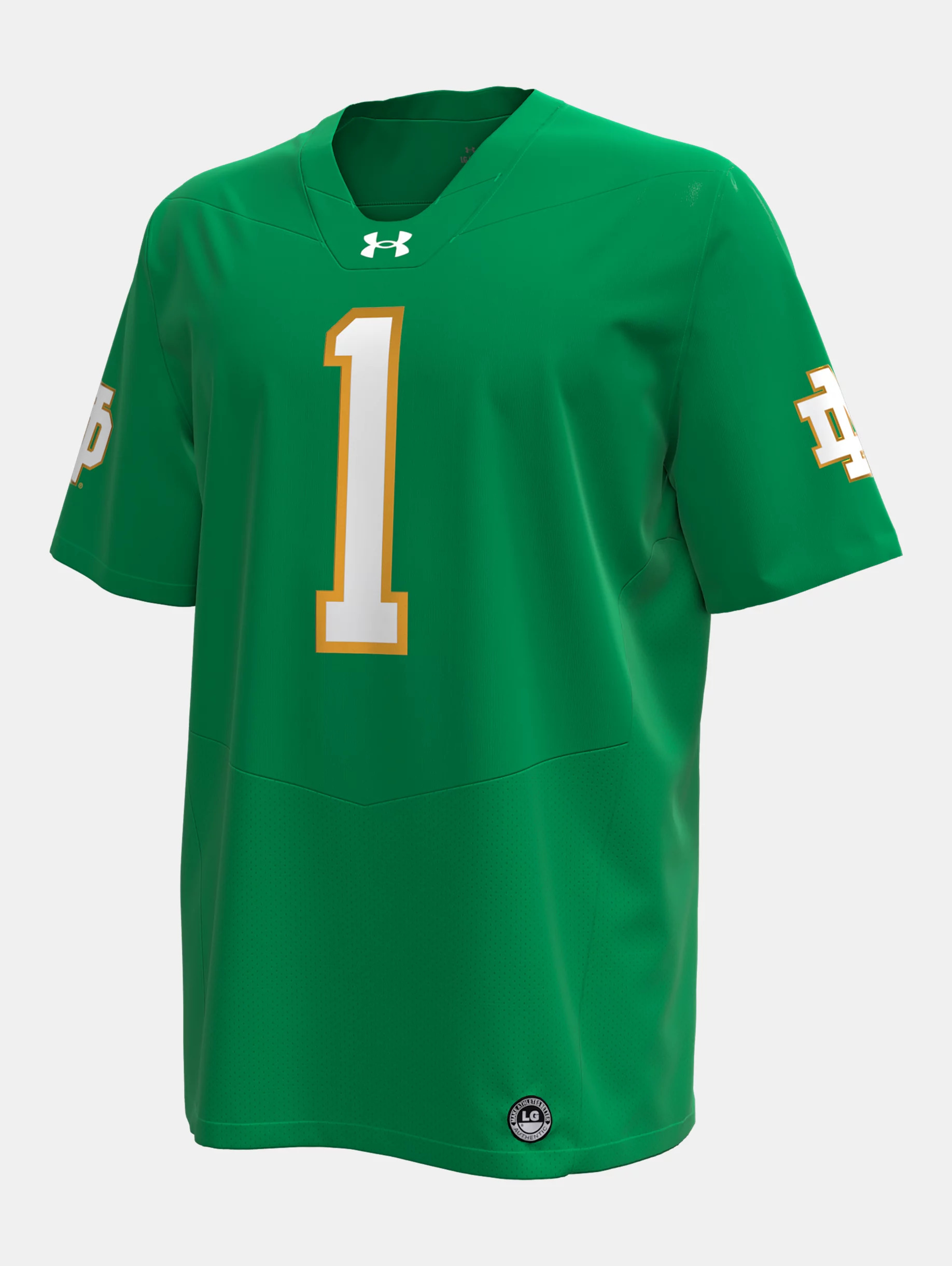 Show your team pride with this replica football jersey from the official outfitter of the Fighting Irish. Product Details - Smooth, durable HeatGear® fabric with strategically placed mesh for the right ventilation - Material wicks sweat & dries really fast - Twill numbers & logos - Custom school jocktag at hem Size & Fit - Fuller cut for complete comfort. Space & Care - Style #: 6014675 - 100% Nylon - Imported